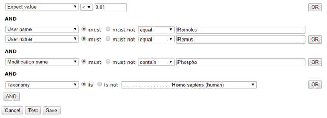 To give an example that illustrates the flexibility of this arrangement, here is a set of filters that will select searches run by either Romulus or Remus and matches that have expect values less than 0.01 and are phosphopeptides and are from a human protein.